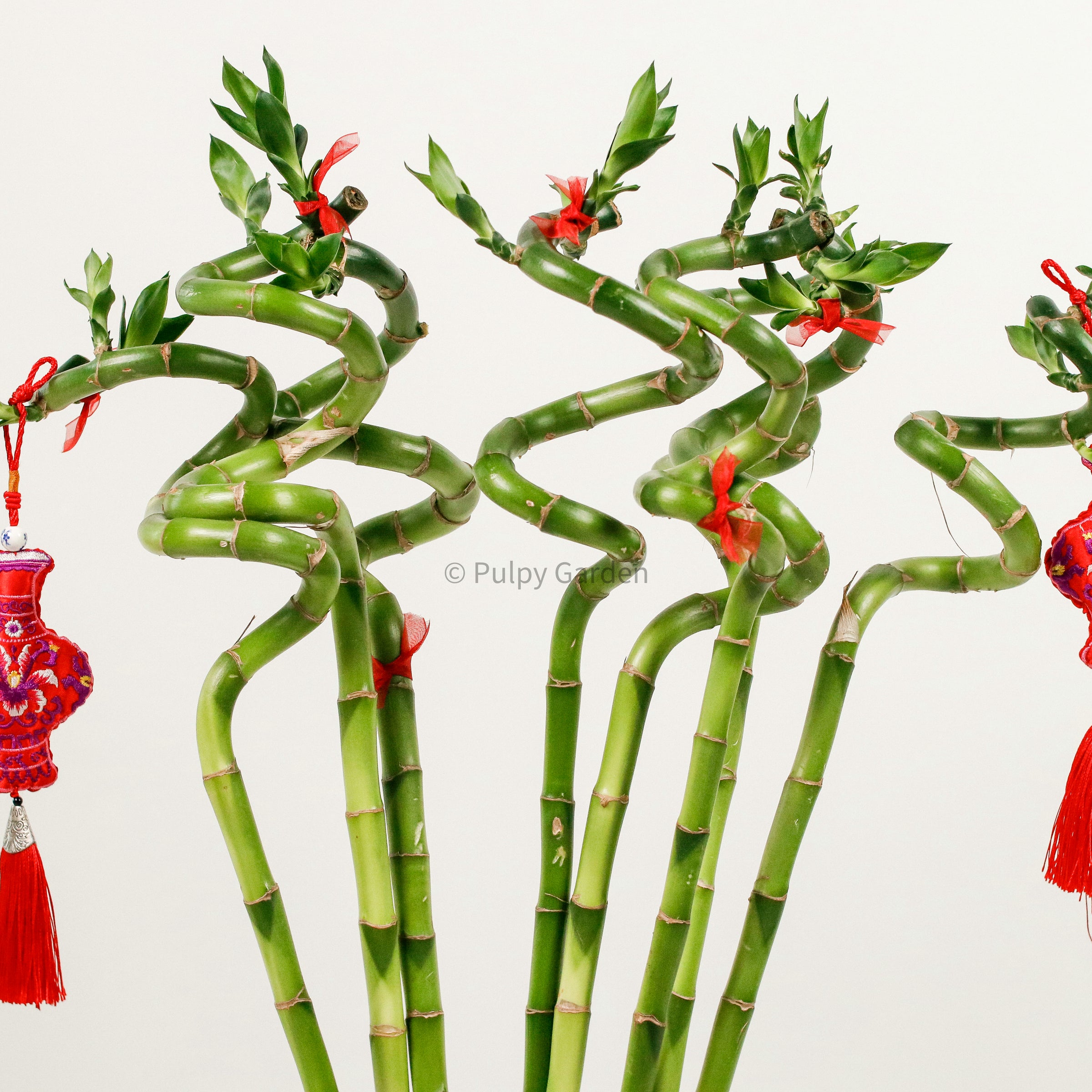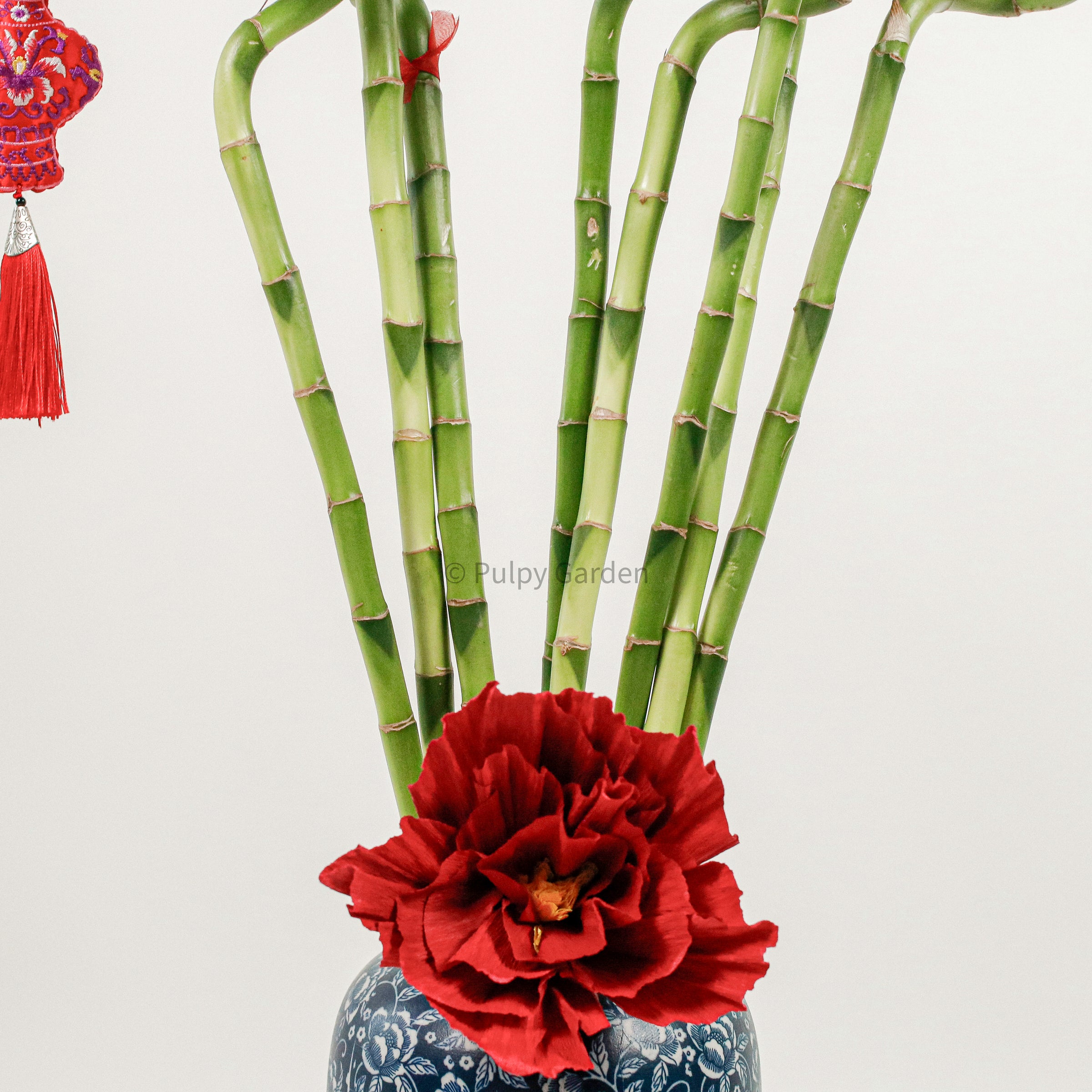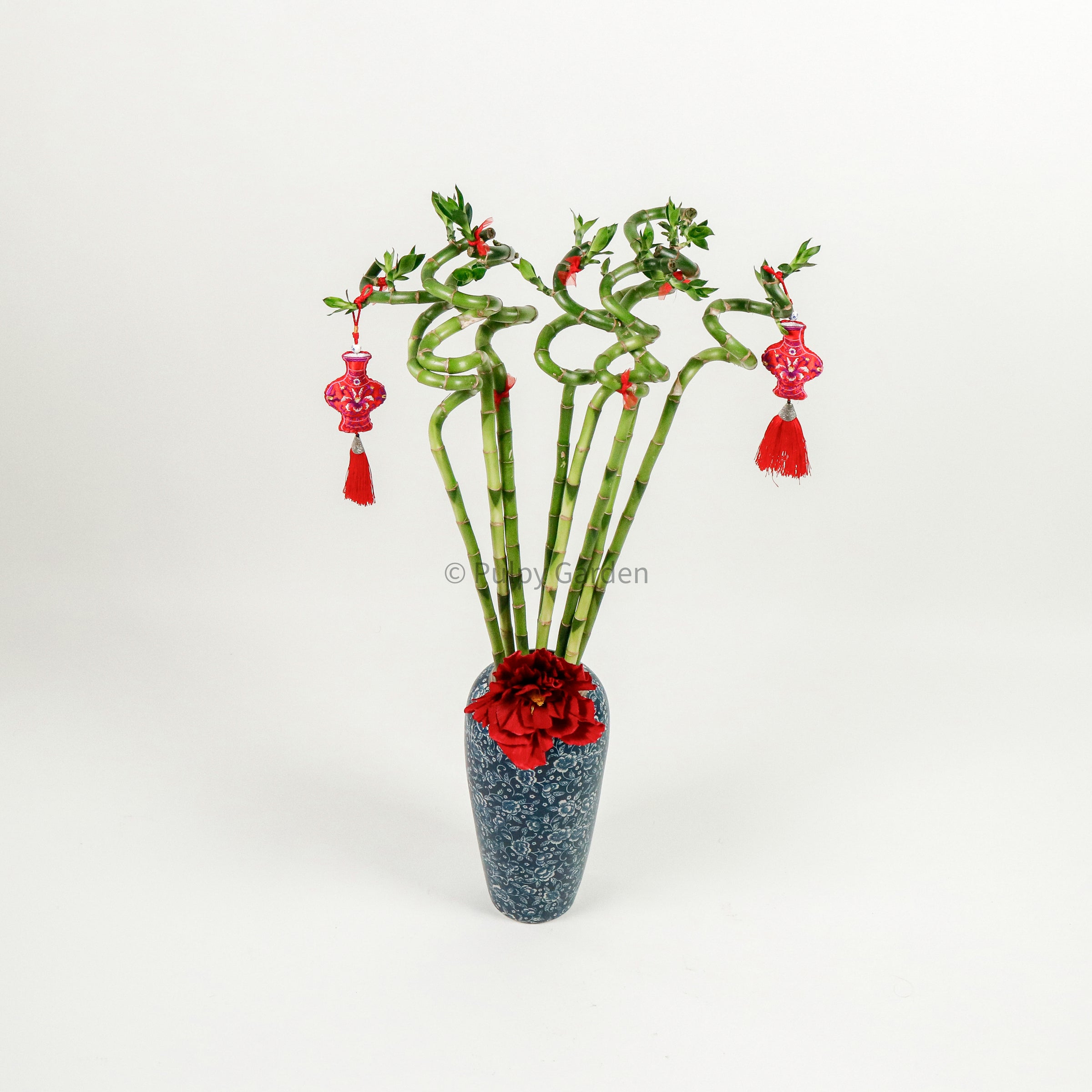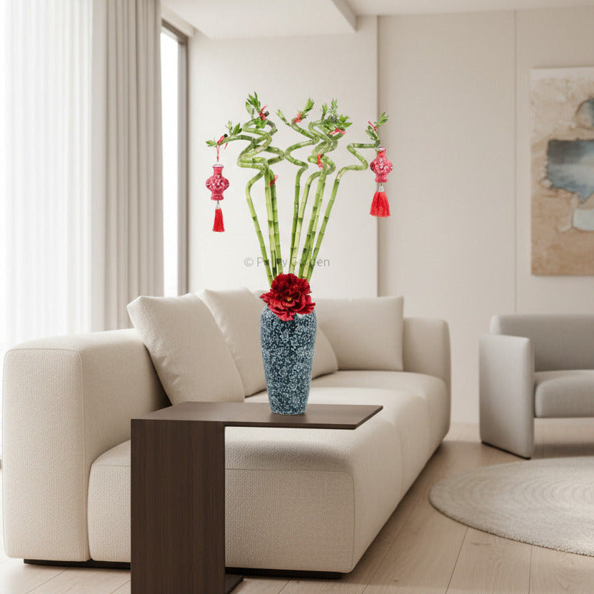 Comes With 8 stems of Lucky Bamboo, 1 x Vase without drainage hole, Ribbons, Paper Flower and 2 Vase Tassels